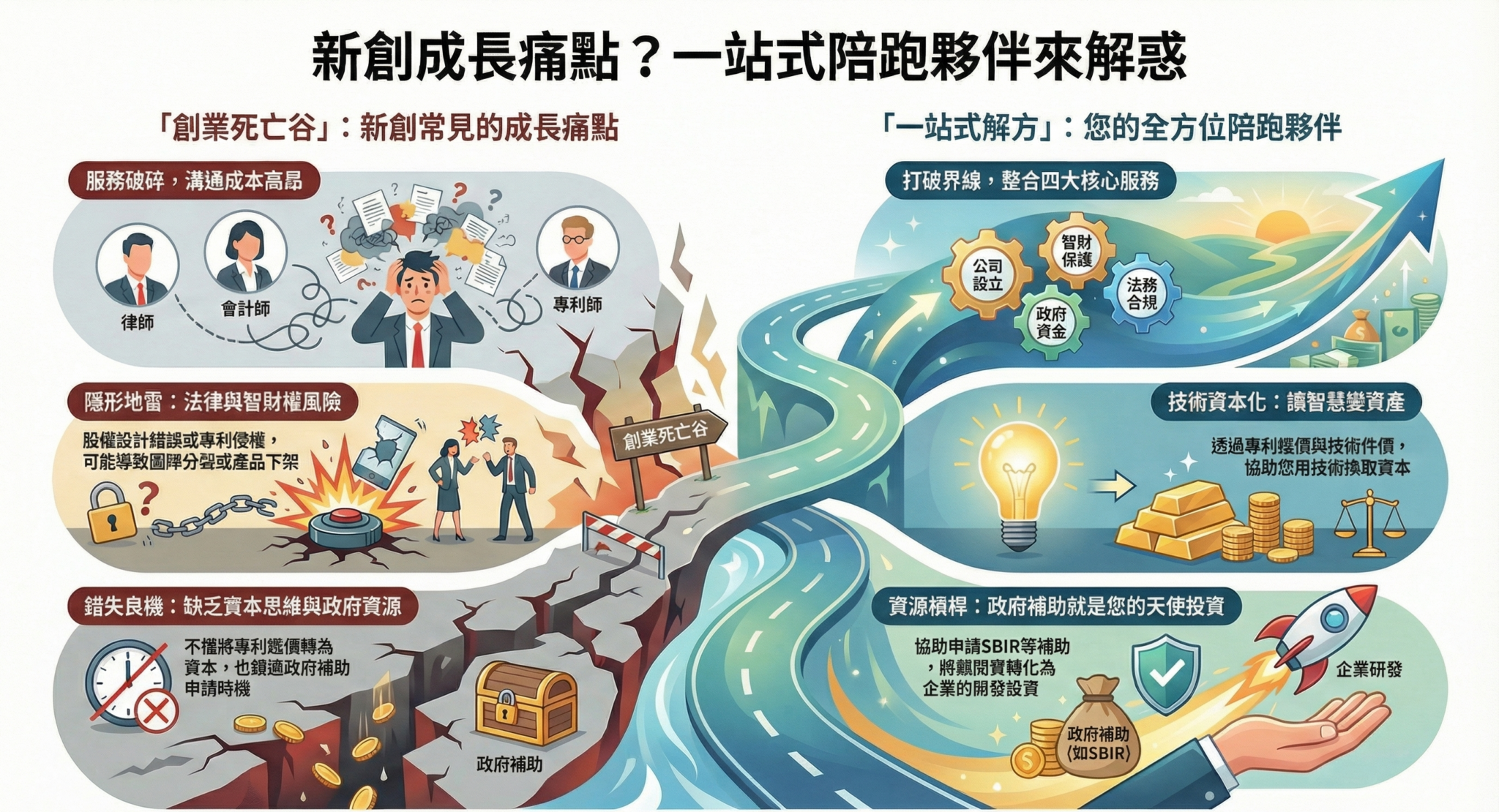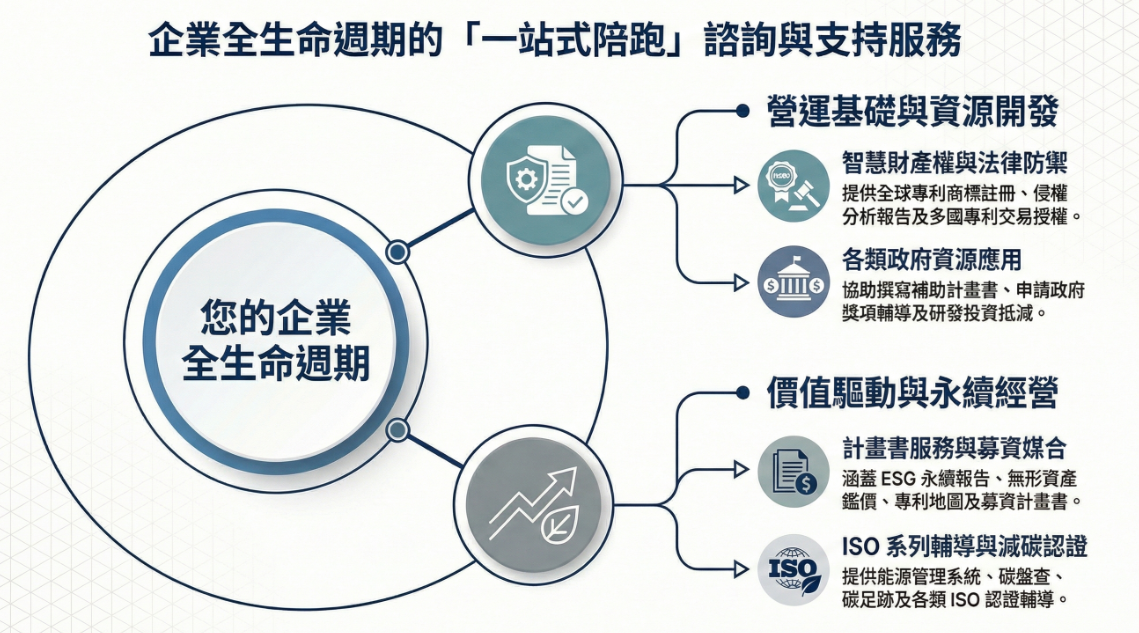 共創臺灣智庫事業機構協助上市櫃公司、中小企業從創新發想至智慧財產保護、政府補助申請,甚至ESG永續發展服務提供全方位解決方案,讓您的企業在全球市場更具競爭力。